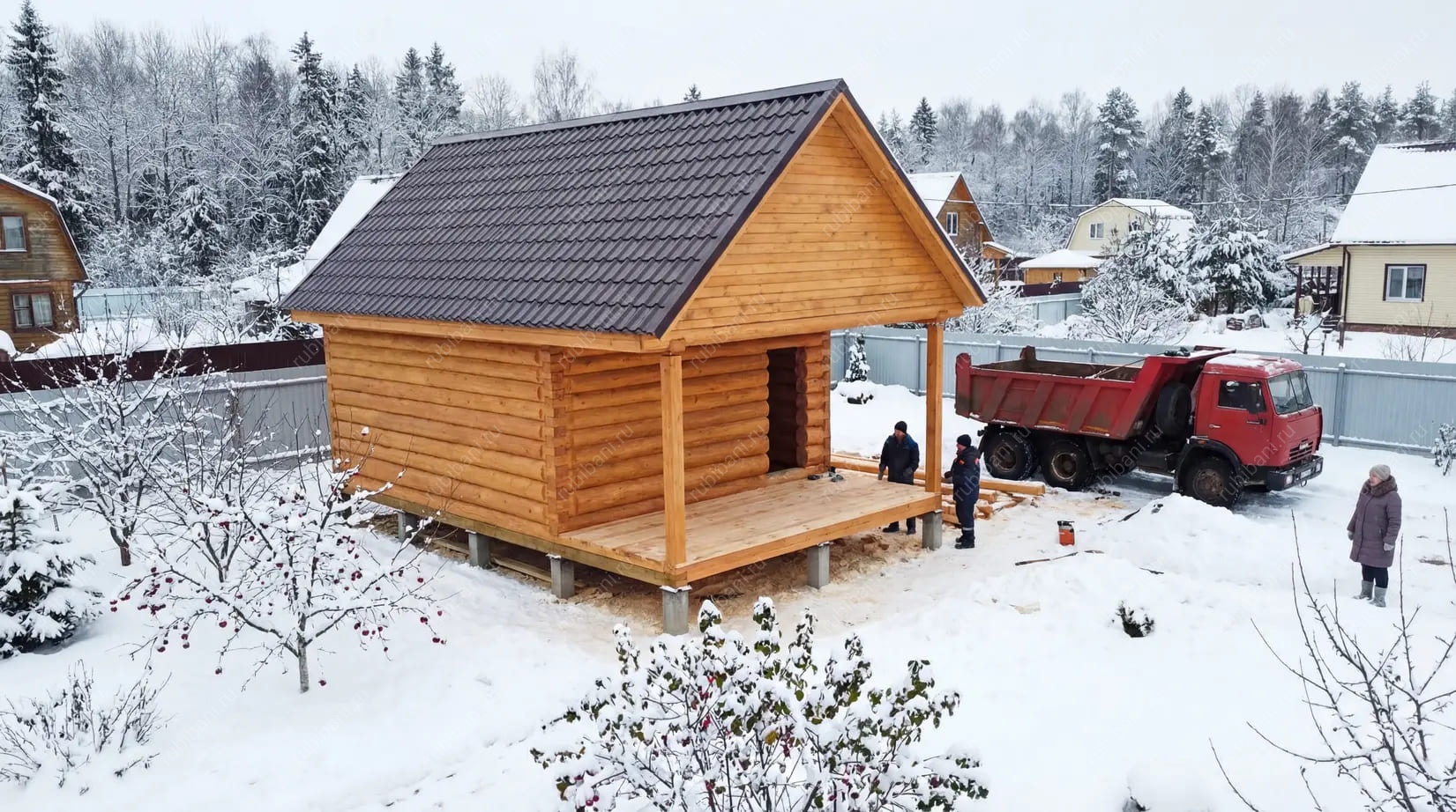 Разгрузка и занос бани к месту строительства до 15 метров — бесплатно. Далее 400 руб за 1 метр заноса.